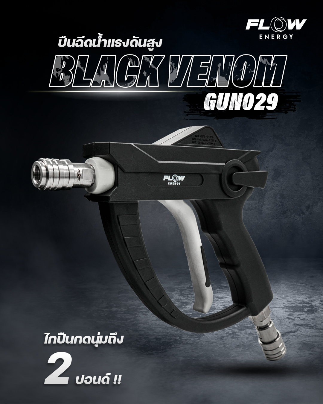 ปืนฉีดน้ำแรงดันสูง Black Venom ไกปืนนุ่ม จากแบรนด์ FLOW ENERGY เป็นอุปกรณ์ที่ออกแบบมาสำหรับการใช้งานกับเครื่องฉีดน้ำแรงดันสูง เหมาะสำหรับงานทำความสะอาดที่ต้องการแรงดันน้ำสูง เช่น การล้างรถ ล้างพื้น และล้างเครื่องจักรต่าง ๆ